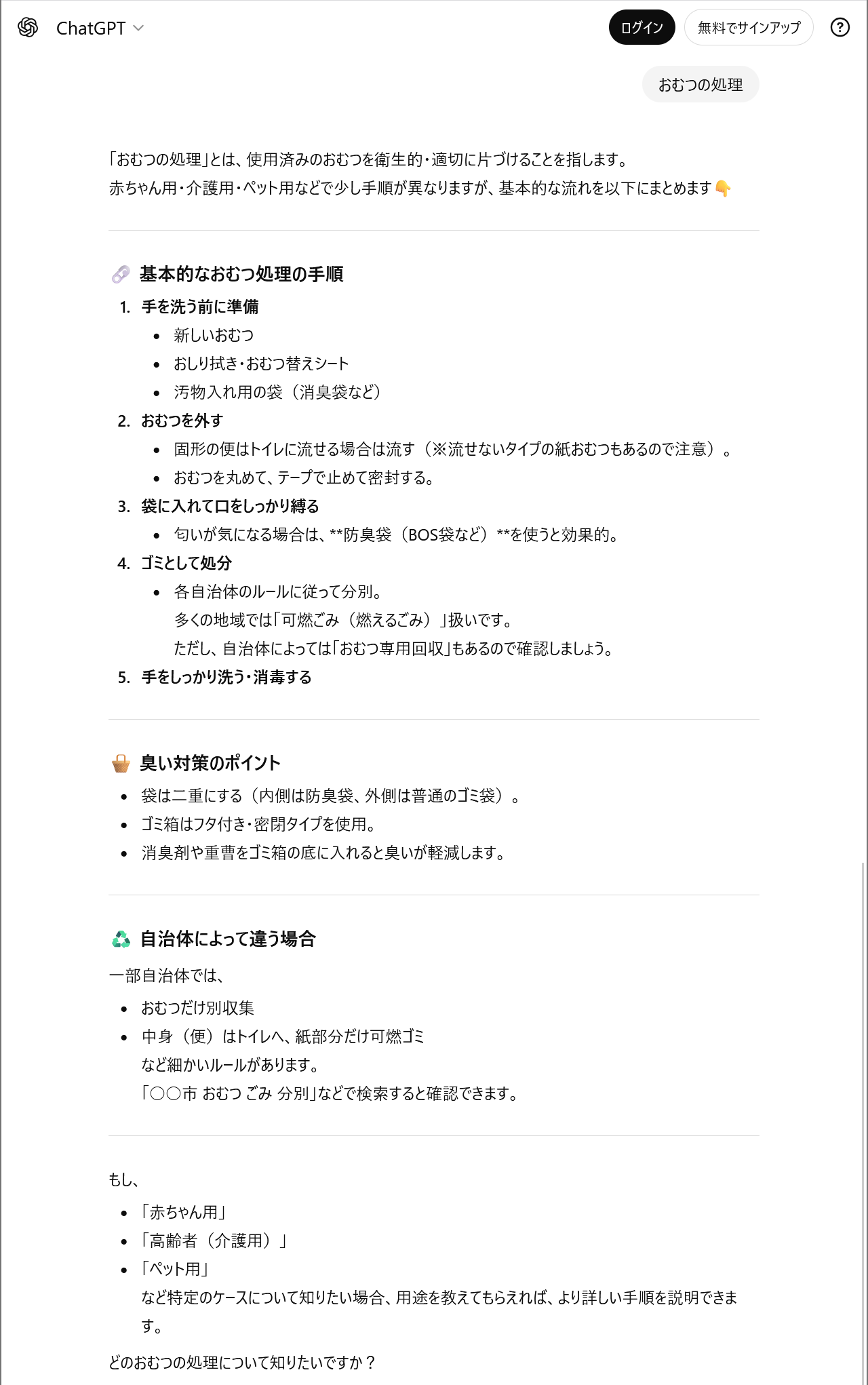 って、じゃあ事後のおむつはどうするんだって? 今一番ナウい解決方法を教えてくれる ChatGPT に聞いてみましょう。